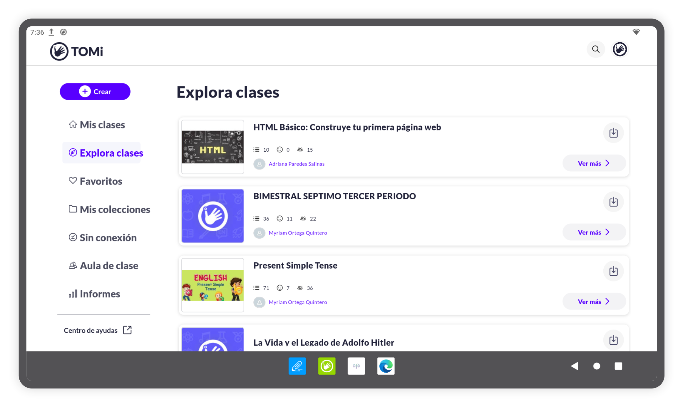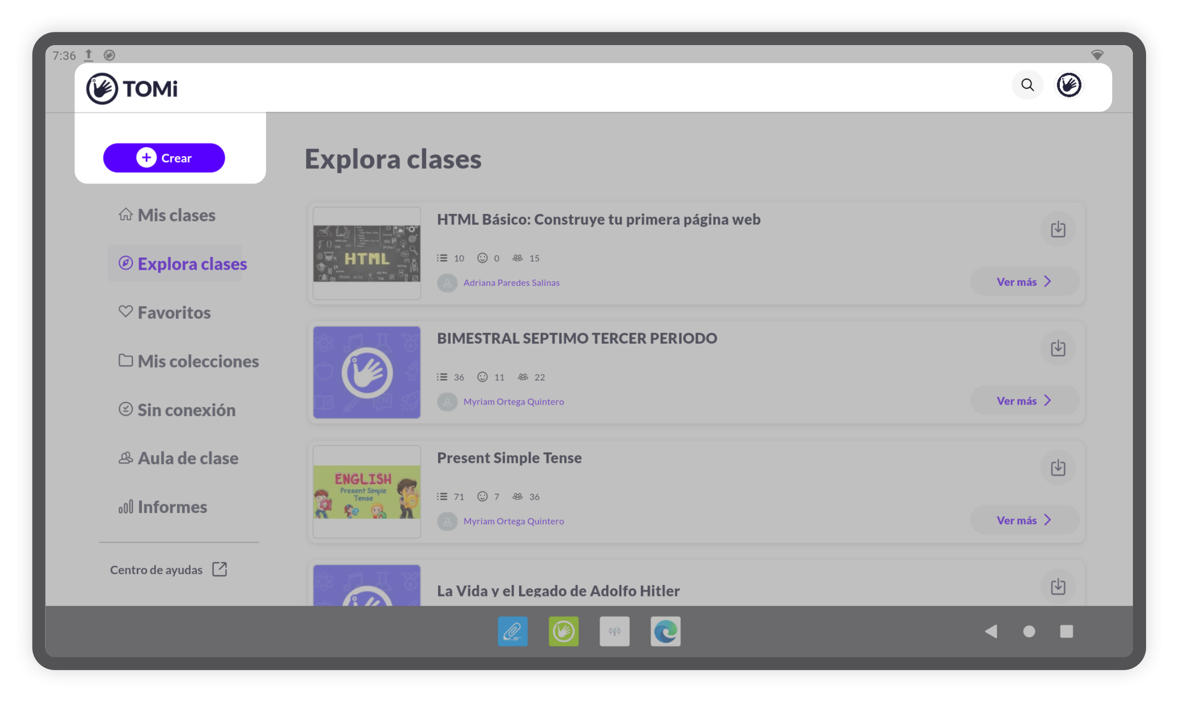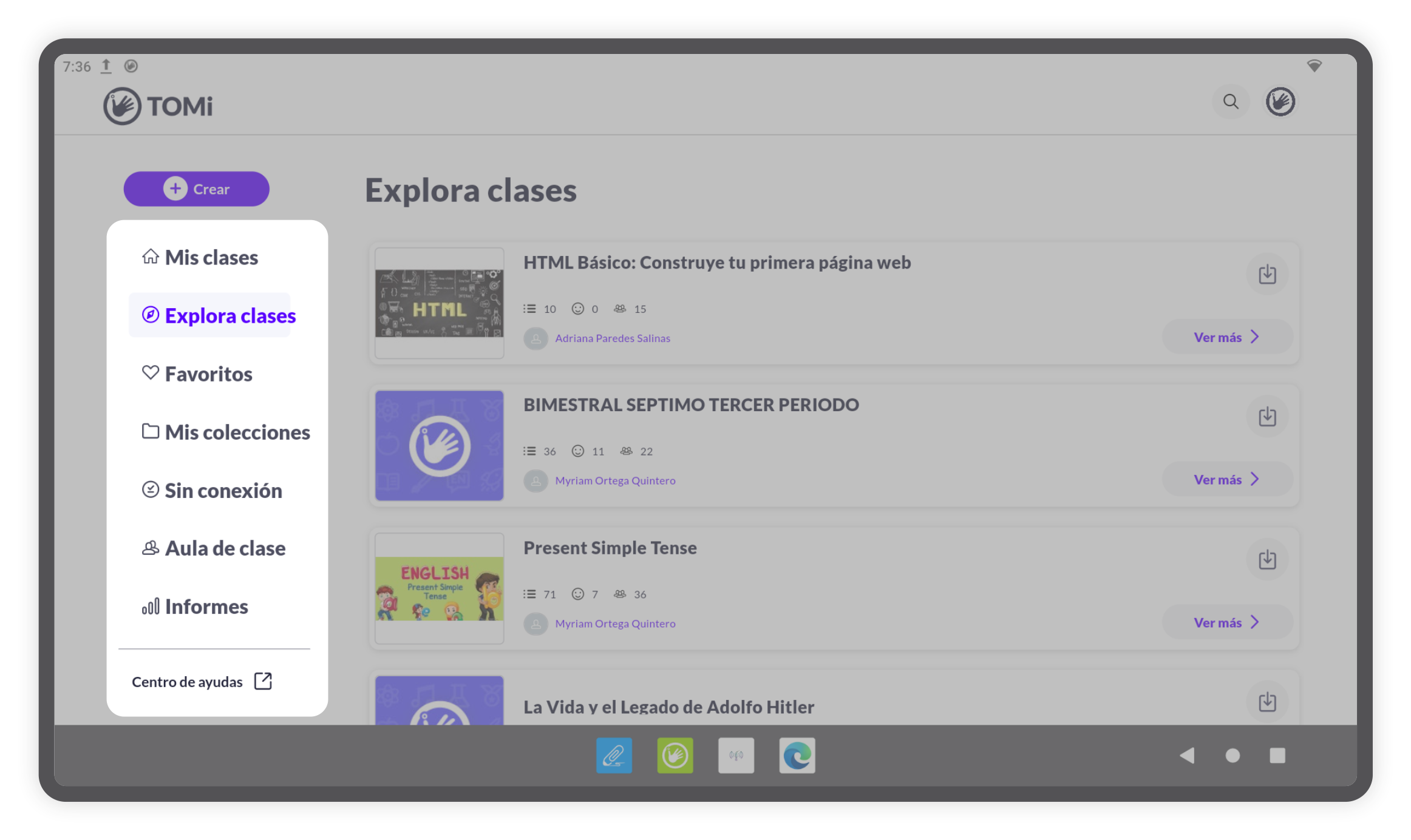 Explora clases: Aquí puedes encontrar un banco de clases y contenido que han creado otros maestros en TOMi Digital.