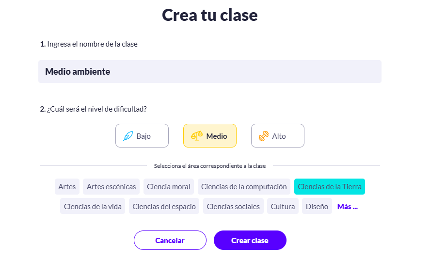 4. Completa los datos de tu clase: digita el nombre, escoge el nivel de dificultad y selecciona el área correspondiente.