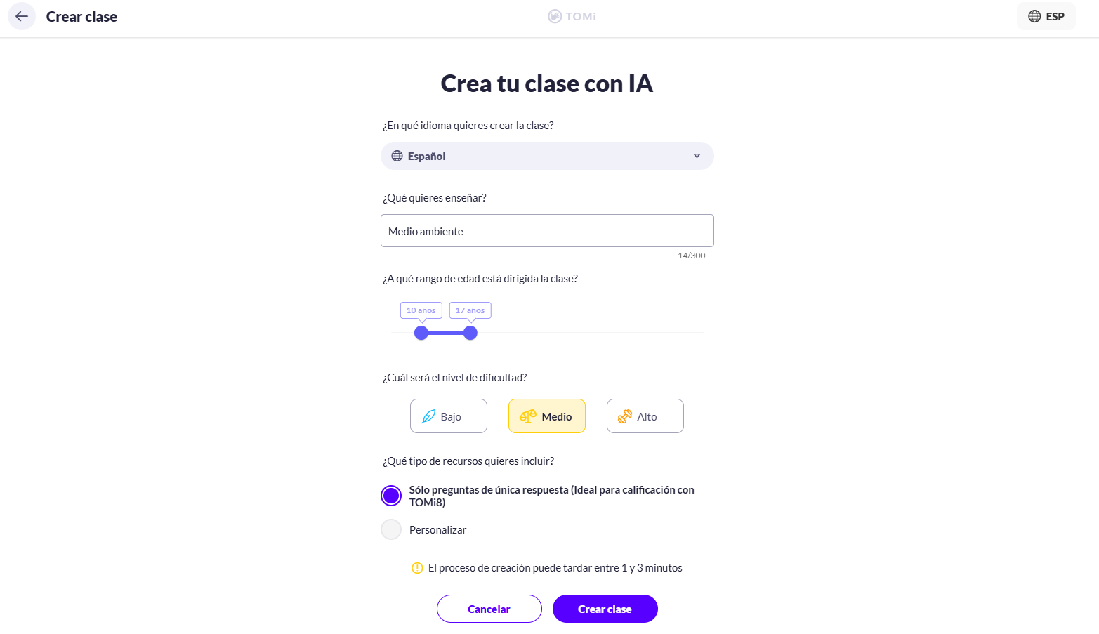 5. Presiona el botón Crear clase y espera que la IA realice su trabajo.