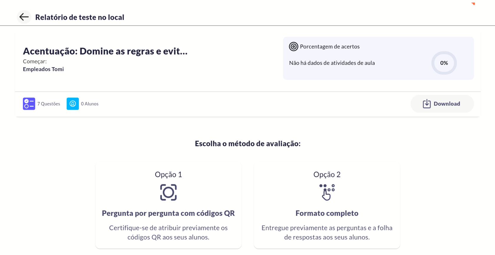 - Avaliação: Toque no botão "Ações", selecione a opção "Avaliar", escolha a sala e depois selecione as perguntas a serem avaliadas. Baixe a folha de perguntas e compartilhe com seus alunos junto com o formato "folha de respostas", por último, escolha a opção 2.