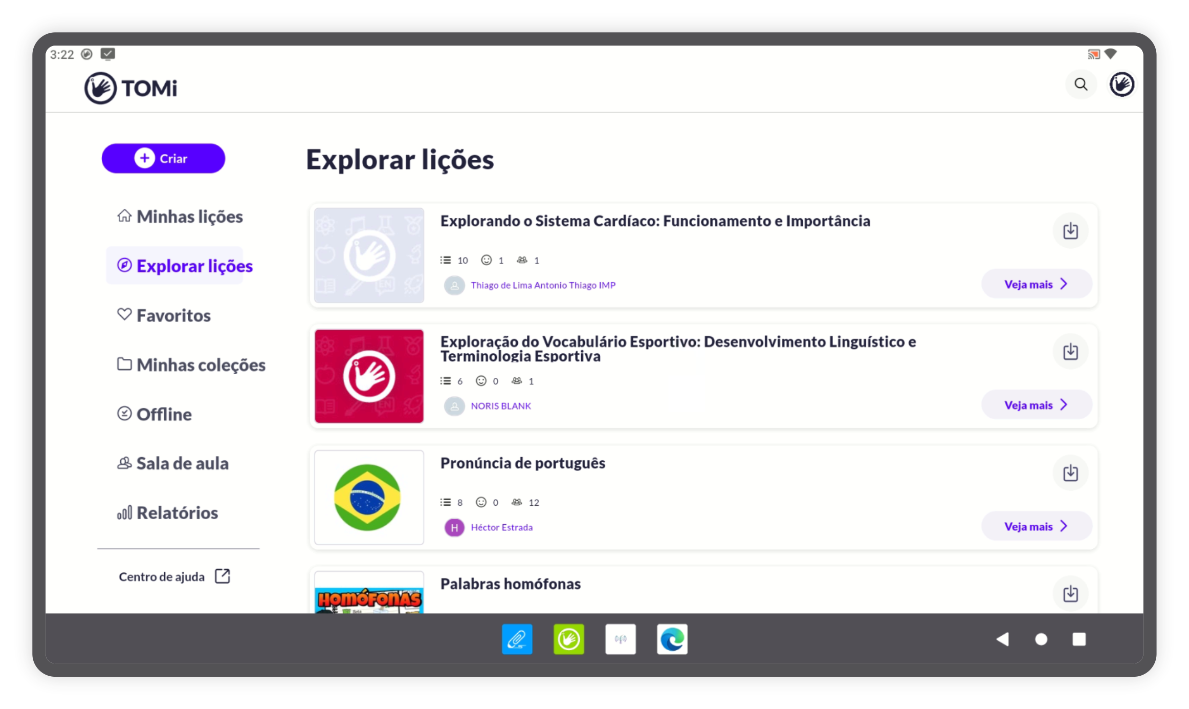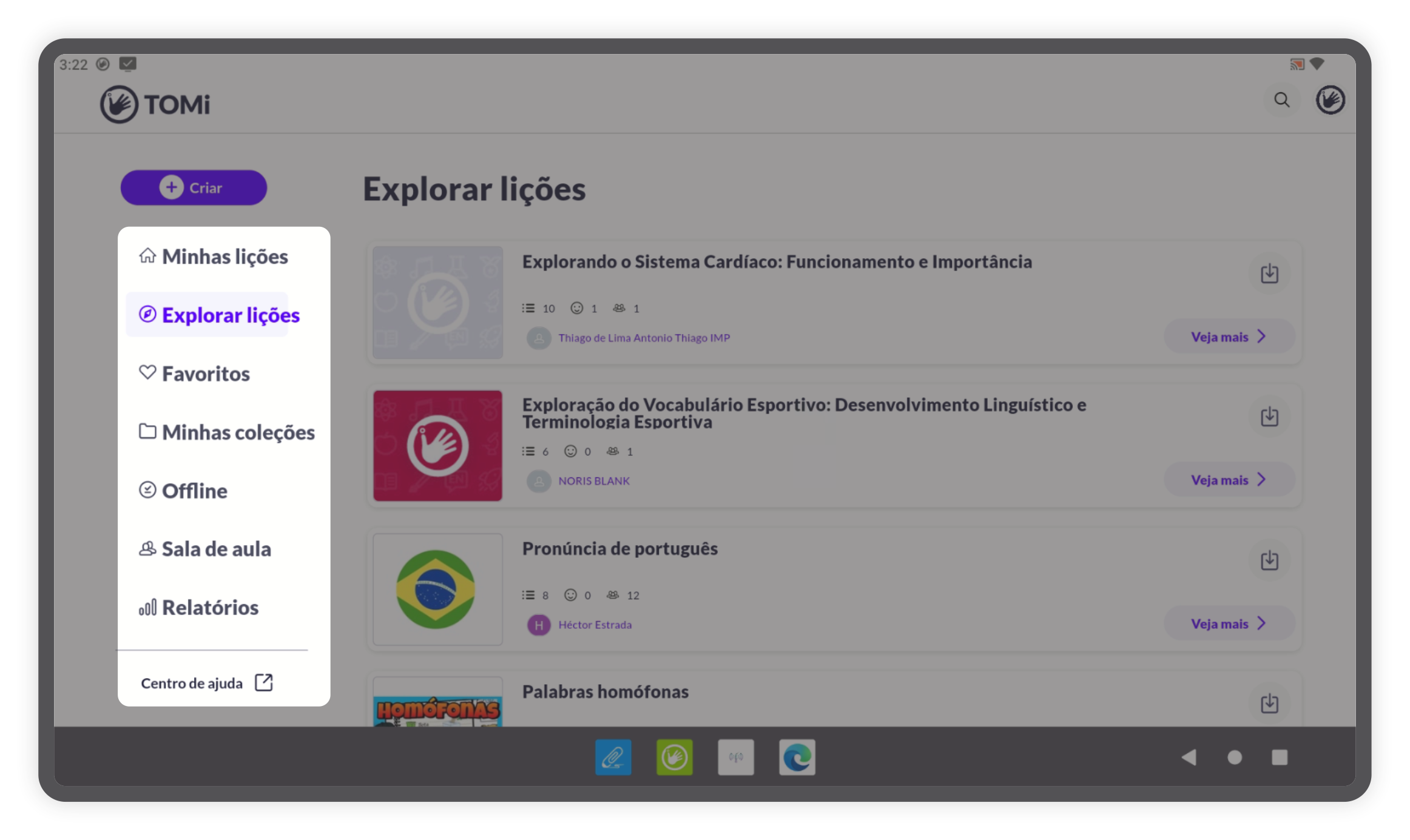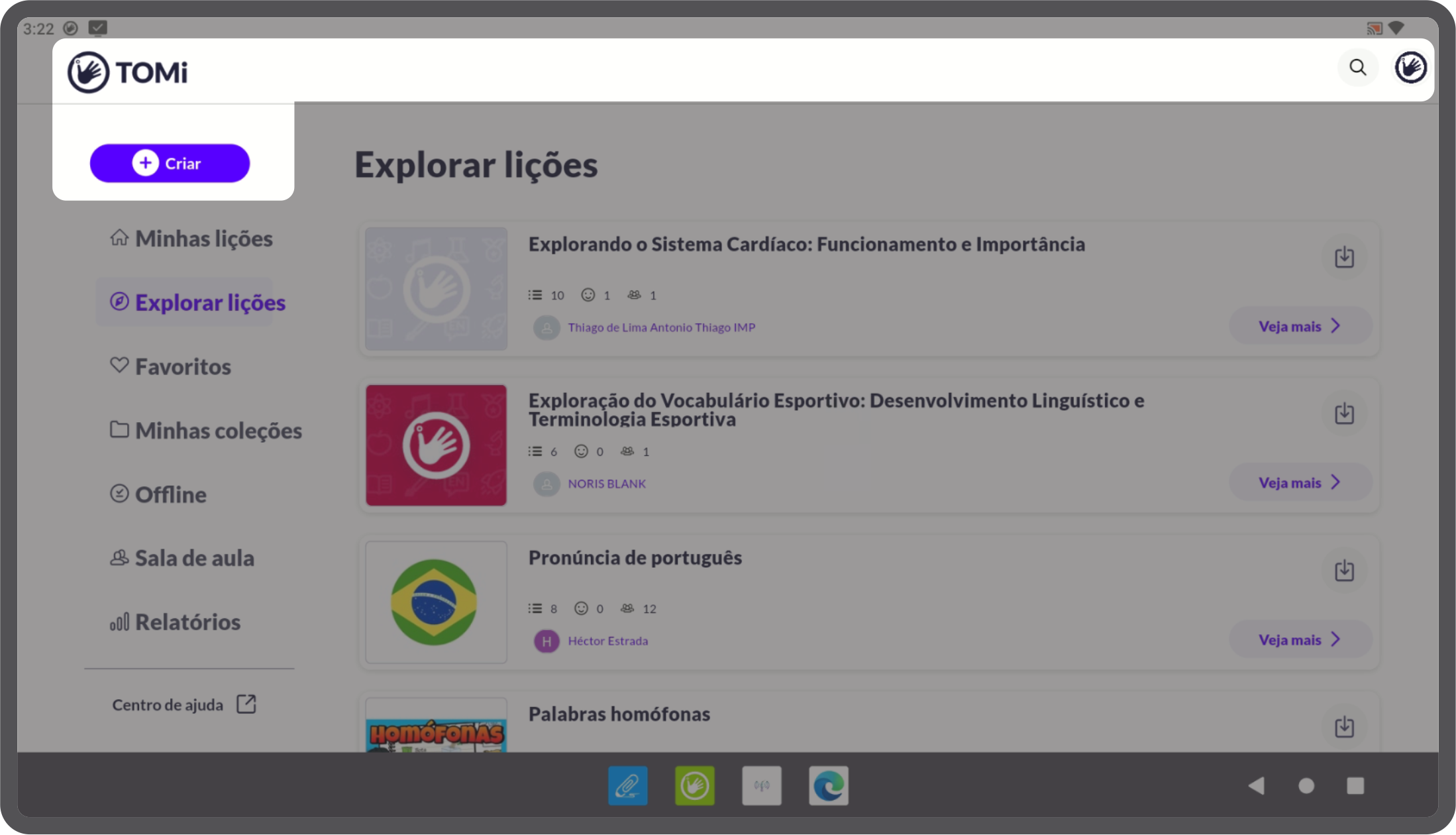- Explorar aulas: Aqui você pode encontrar um banco de aulas e conteúdos criados por outros professores no TOMi Digital.
