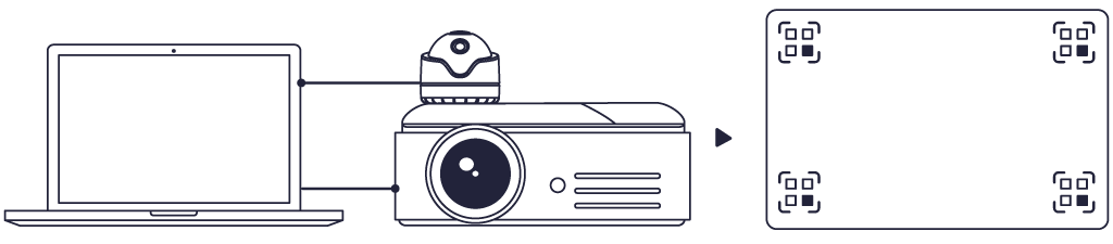 • Calibração automática: aparecerão 4 códigos QR em verde na tela; a câmera os detectará e a calibração será feita sozinha. Certifique-se de que a câmera enxergue toda a projeção.
