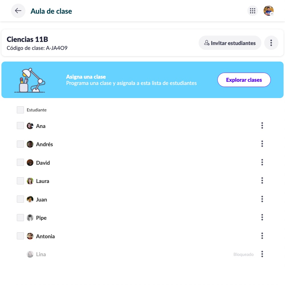 Ahora es posible eliminar, bloquear y desbloquear, estudiantes en tus Aulas de clases. Los estudiantes que se eliminan pueden volver a ingresar luego a través del código de la clase, mientras que la opción de bloqueo la puedes desactivar haciendo clic sobre el usuario que deseas admitir nuevamente.